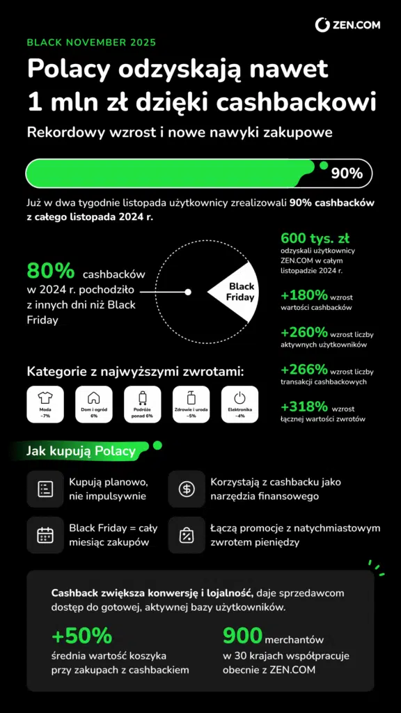 W całym listopadzie 2024 r. użytkownicy ZEN.COM odzyskali dzięki cashbackowi ponad 600 tysięcy złotych, a w 2025 r. tempo wzrostu jest jeszcze wyższe. Od 1 do 14 listopada 2025 r. wartość wygenerowanych zwrotów była wyższa aż o 180% wyższa niż w analogicznym okresie rok wcześniej. Tak dynamiczne otwarcie miesiąca pozwala prognozować, że tegoroczny Black November może zakończyć się rekordową wartością zwrotów.